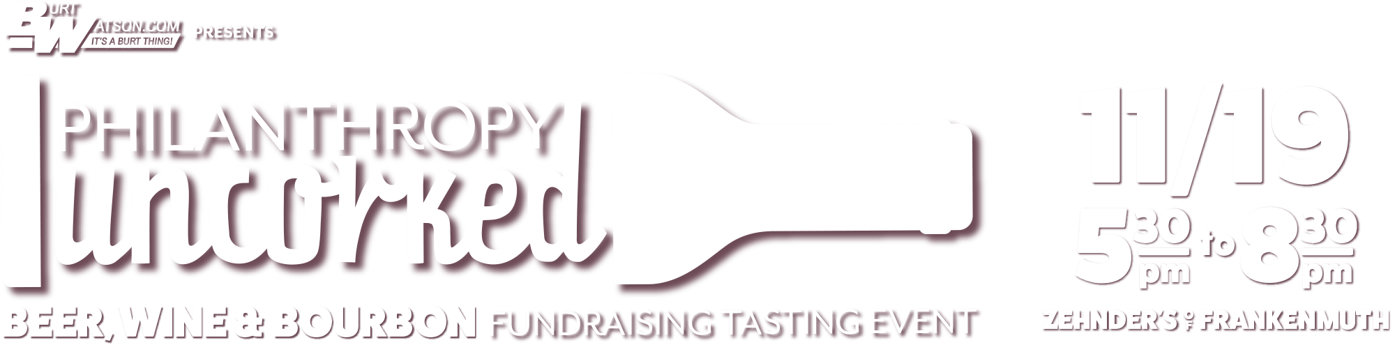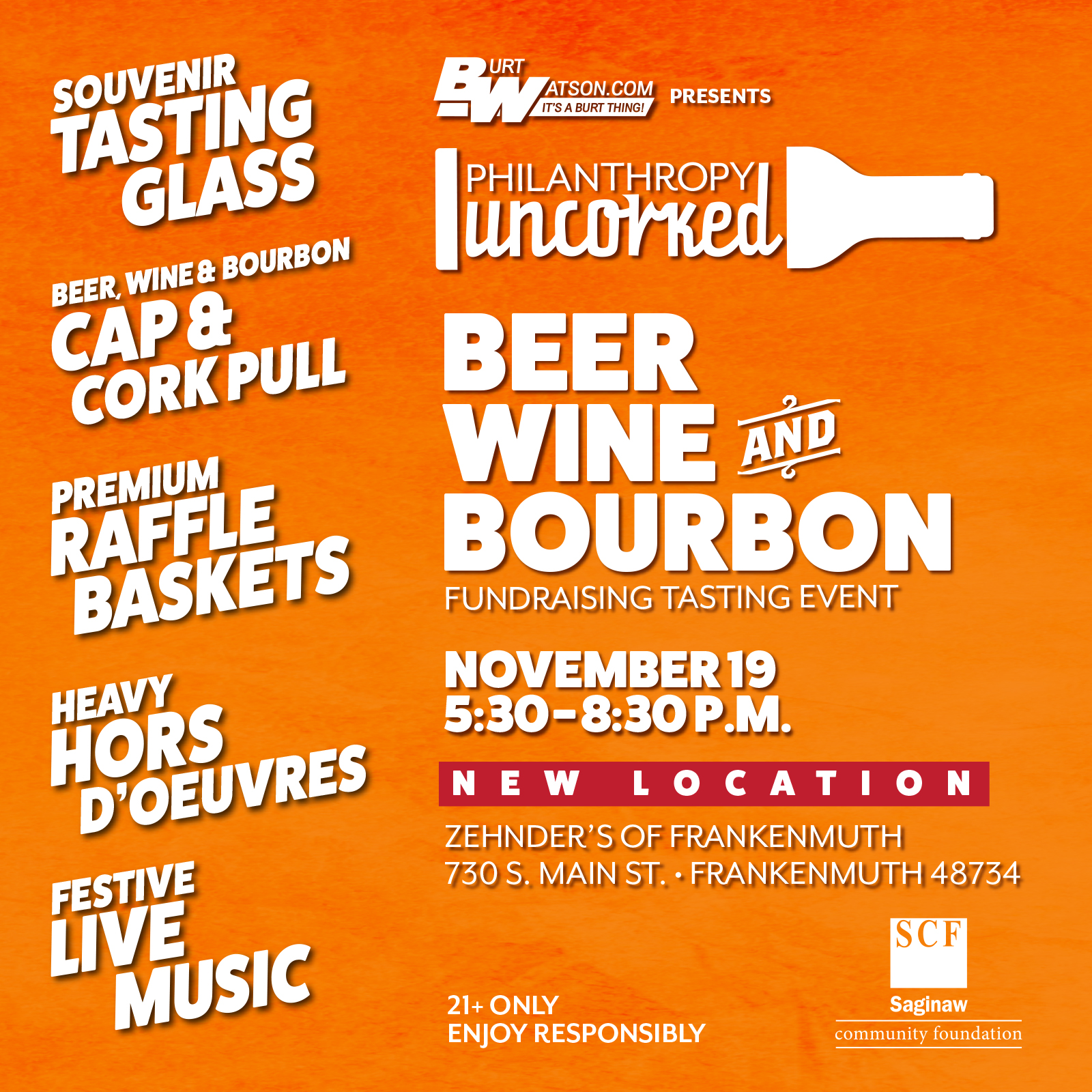 Join Saginaw Community Foundation on Wednesday, November 19 from 5:30 – 8:30 p.m. at Zehnder’s of Frankenmuth for the 5th Annual Philanthropy Uncorked: A Beer, Wine & Bourbon Fundraising Tasting Event, presented by Burt Watson! Admission is $75 for one; $100 for two. Each admission comes with a commemorative tasting glass with five tasting tickets and heavy hors d’oeuvres. All beer, wine & bourbon tasting selections by Oppermann’s Cork & Ale.